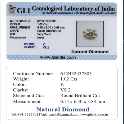 The GLI Certificate provides a reliable and accurate documentation of a diamond's identity and grade based on the internationally recognized diamond grading system.